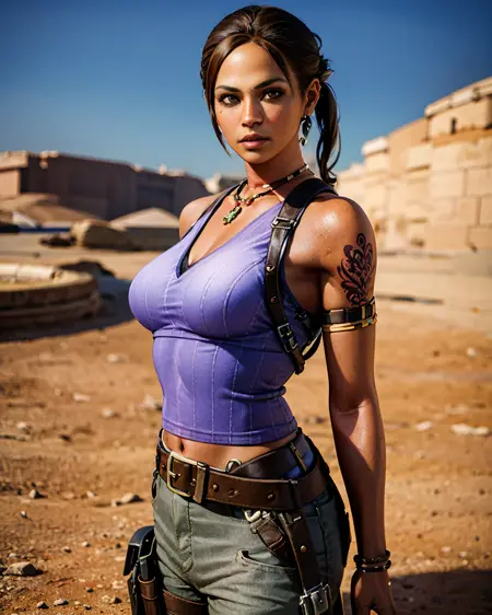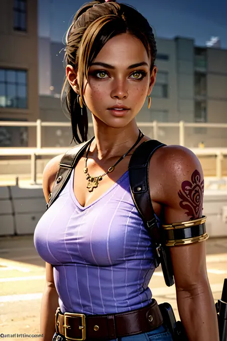 You may add short ponytail, tank top, tatoo, grey pants, armlet, holster, multiple belts, necklace in positive prompt if you want RE5 outfit.