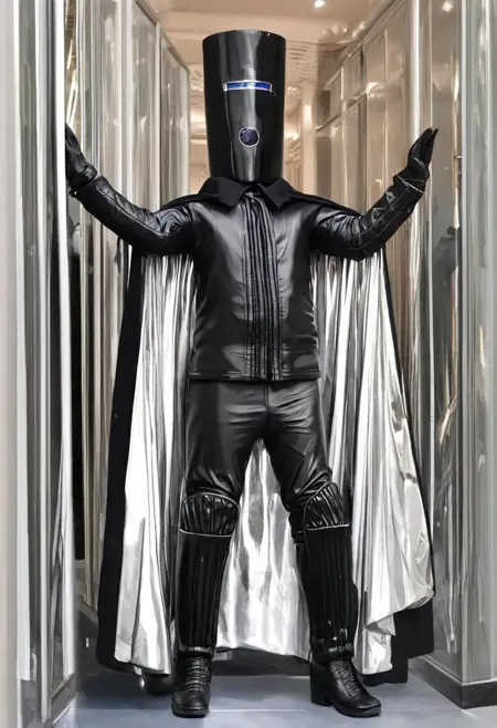 | トレーニングワード | lbh01, tall black cylindrical helmet, glossy surface, narrow blue horizontal slit near top, small silver circle below slit, seamless neck connection, black leather bodysuit, vertical ribbed chest panel, silver inner lining cape, long black cape, leather gloves, leather boots, padded knee guards, zipper front jacketコピーしました! |