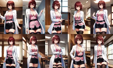 아우트핏1aaryouko, short hair, cleavage, pink shirt, labcoat, belt, miniskirt, black skirt, black thighhighs