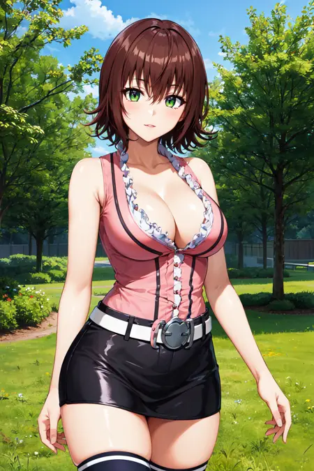 아우트핏2aaryouko, short hair, cleavage, pink shirt, sleeveless, belt, black skirt, miniskirt, black thighhighs