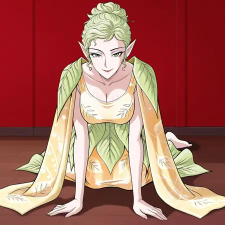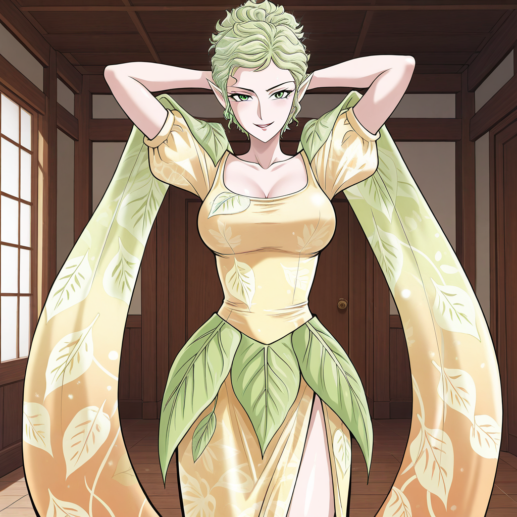 | Trained Words | mp_fwt, 1girl, solo, mature female, green eyes, green hair, short hair, single hair bun, tall female, large breasts, pointy ears, long dress, yellow dress, floor length dress, leaf-themed dress, leafy skirt, puffy sleeves, shoulder cape, barefootCopied! mp_fwt_ch, 1girl, solo, mature female, green eyes, green hair, short hair, tall female, large breasts, pointy ears, hooded cloak, cloakCopied! mp_fwt_es, 1girl, solo, mature female, green eyes, green hair, short hair, tall female, large breasts, pointy ears, fur coat, hood, fur trimCopied! |