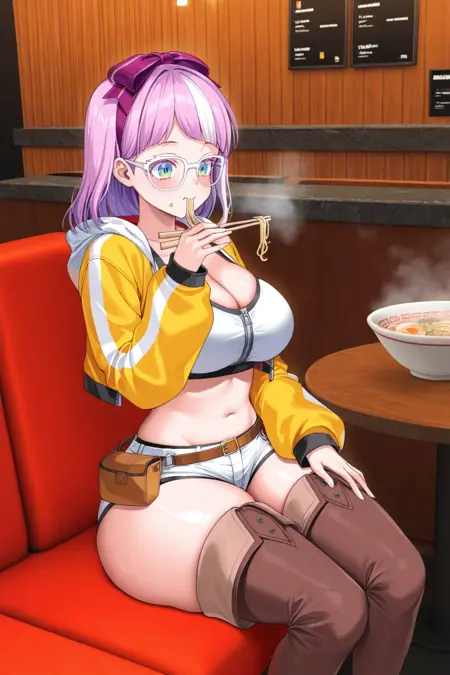 白フレームの眼鏡、紫のリボン、髪のリボン、スポーツブラ、白いブラ、カーディガン、オープンカーディガン、黄色のカーディガン、長袖、白いショートパンツ、短いショートパンツ、ベルトポーチ、