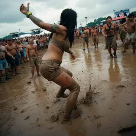 **원한다면 "mudfest 야외 콘서트 페스티벌의 사진으로, 수십 명의 흙투성이 사람들이 진흙 속에서 춤추고, 흐린 날씨 속에서 시끄러운 야외 레이브가 펼쳐지며, 두꺼운 허벅지, 문신, 코른 롤 머리 를 지닌 반소매 차림의 여자들이 흙으로 뒤덮혀 있다." 라고 시도해 볼 수도 있습니다.