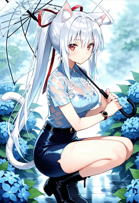 1girl,红眼睛,白发,长发,马尾,天线辫,刘海,长侧发,中等胸部,红色发带,
