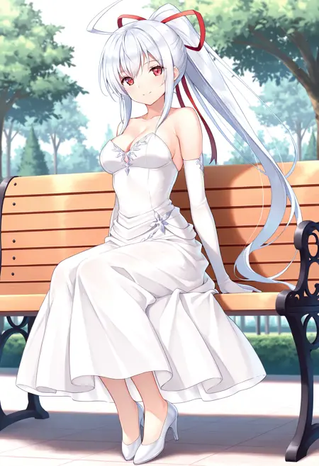 1girl,red eyes,white hair,long hair,ponytail,ahoge,bangs,long sidelocks,medium breasts, red hair ribbon,