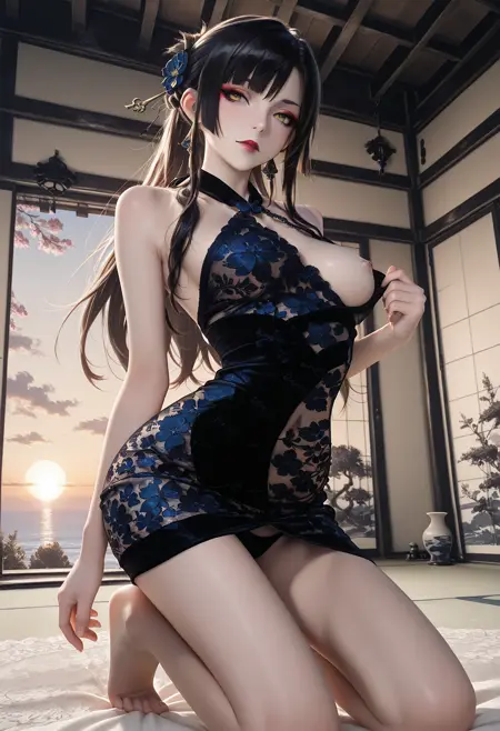 very short dress, neckhalter dress, revealing clothes, see-through dress, floral print, backless dress, velvet dress,