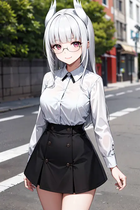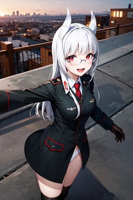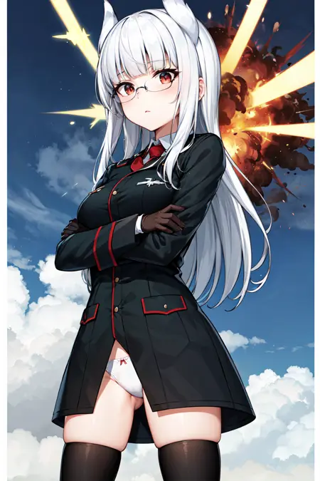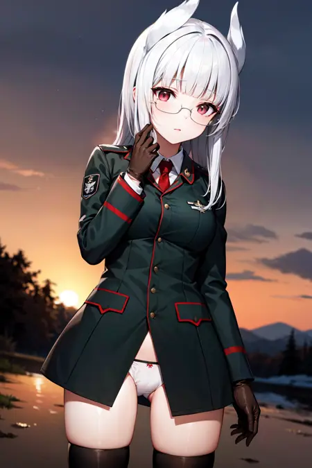 aahws, 긴 머리, 흰색 머리, 머리 날개, 곧은 앞머리, 안경, 군복, 빨간 넥타이, 검은 재킷, 긴 소매, 갈색 장갑, 바지 없음, 흰색 팬티, 검은 허벅지 양말