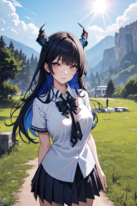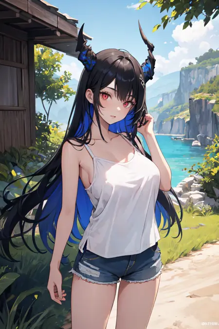 프롬프트: nerissa ravencroft, 매우 긴 머리, 곧은 머리, 파란색 내부 머리카락, 불균형한 뿔, 큰 가슴, 좁은 동공, 장갑, 어긋난 다리 착용물, 불균형한 다리 착용물, 한쪽 다리용 스타킹, 한쪽 허벅지용 양말, 계층적 반 스커트, 테셀 머리 장식,