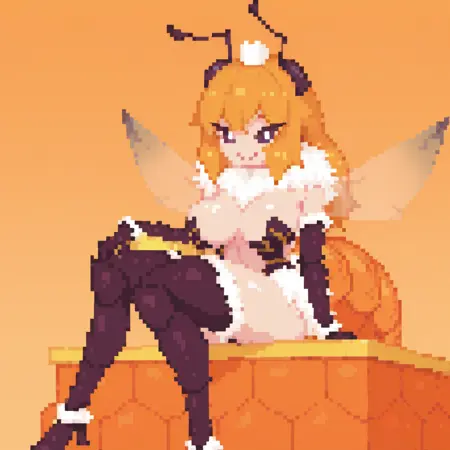 quebeedx, arthropod girl, monster girl, antennae, long hair, orange hair, bee girl, extra eyes, abdomen tail, crown, neck fur, body fur, wings, breasts, panties