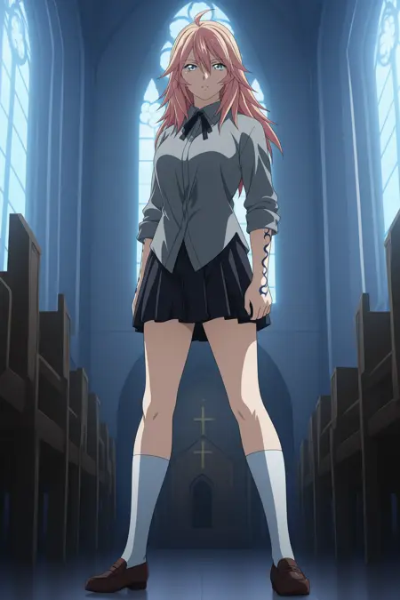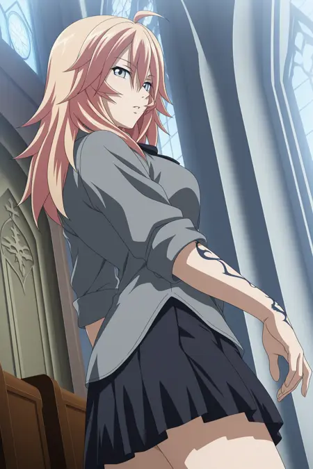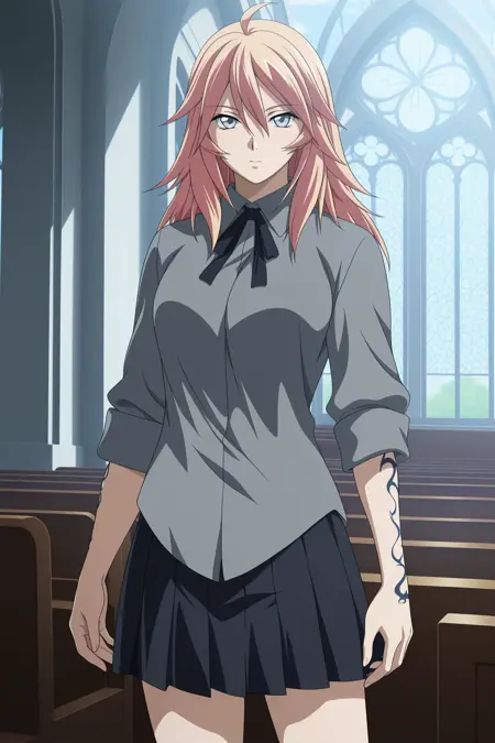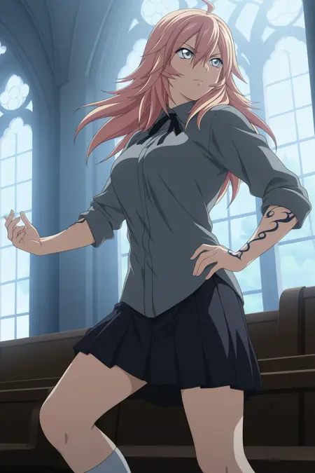 shibai chuutatsu, long hair, brown hair, ahoge, wispy bangs, hair between eyes, grey eyes, three-quarter sleeves, sleeves rolled up, arm tattoo, dragon tattoo, grey shirt, collared shirt, black ribbon, neck ribbon, untucked shirt, black skirt, pleated skirt, white socks, kneehighs, brown footwear, loafers