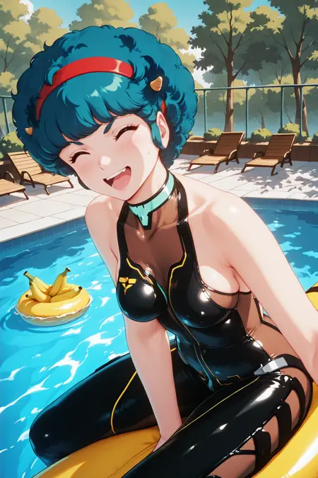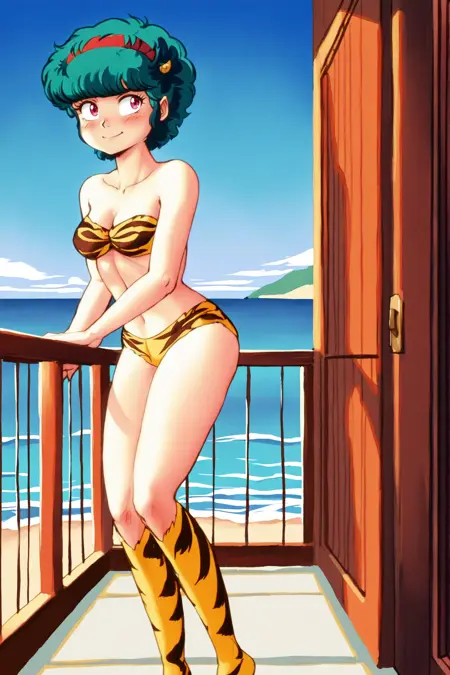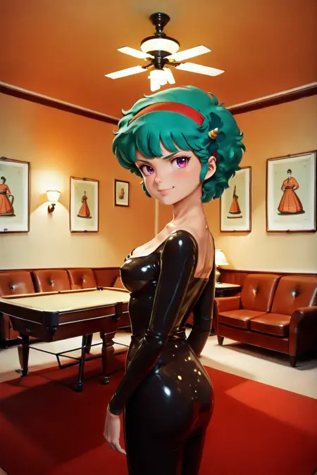 主提示词:TenMom,红眼睛,短发,绿发,卷发,发带,角,鬼,复古艺术风格,1980年代(风格)