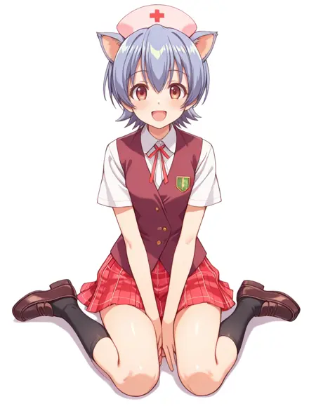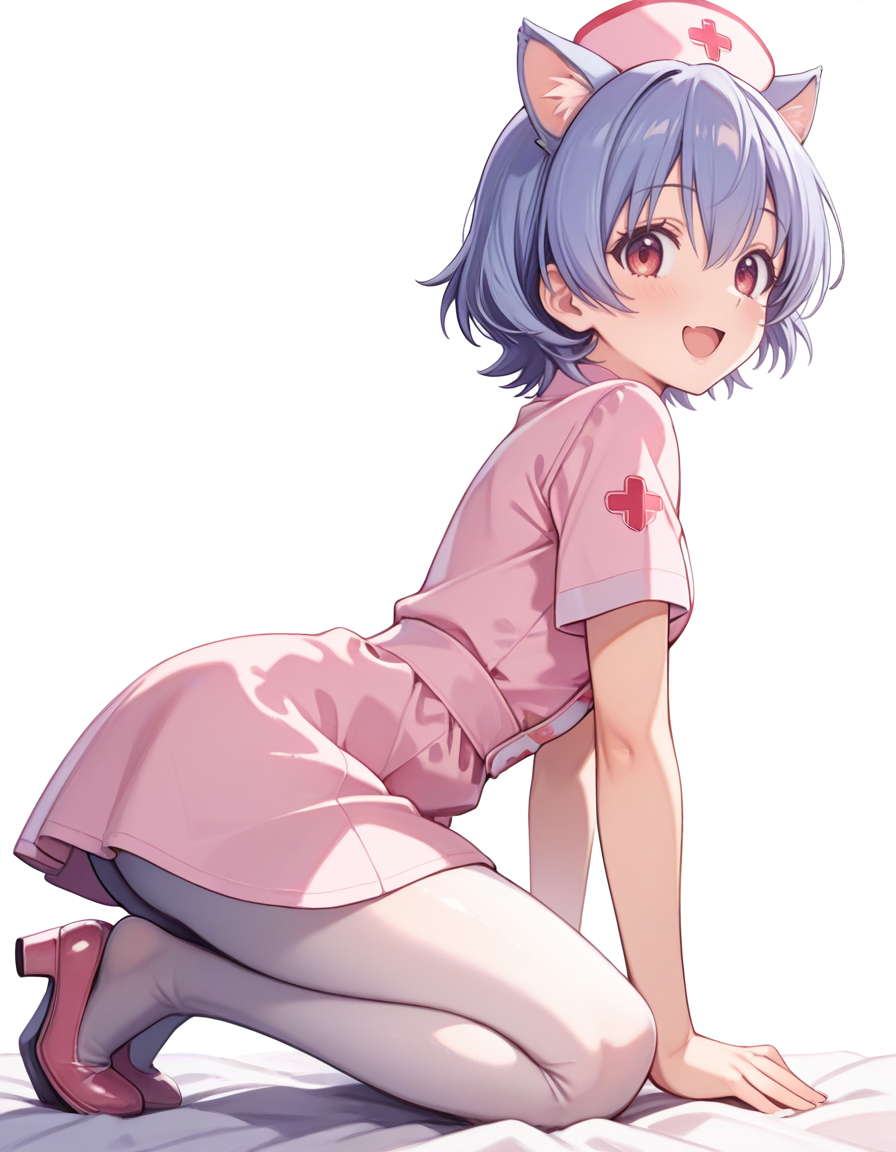 特にナース衣装は積極的に学習していませんが nurse cap とか animal ears をワードに加えると、なんとなくそれっぽい姿になるかもしれません。作例のナース服姿には nurse cap, pink nurse clothes, animal ears, white pantyhose, pumps, と入れてあります(nurse clothesはnurse uniformでも)。