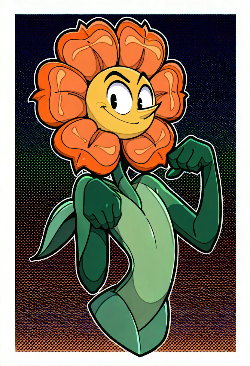CagneyCarnation, 1boy, cartoonish anthropomorphic flower, orange bloom, yellow face, orange petals, green stem-like body, leaf-like hands, yellow thorns, feet resemble leafy vines, plant-like design, black eyes