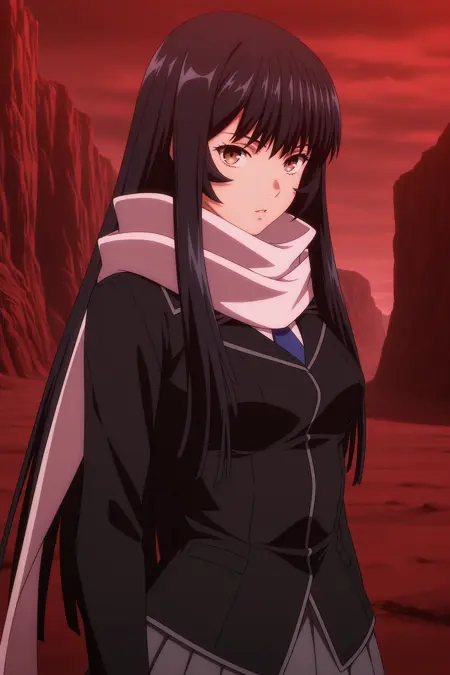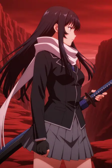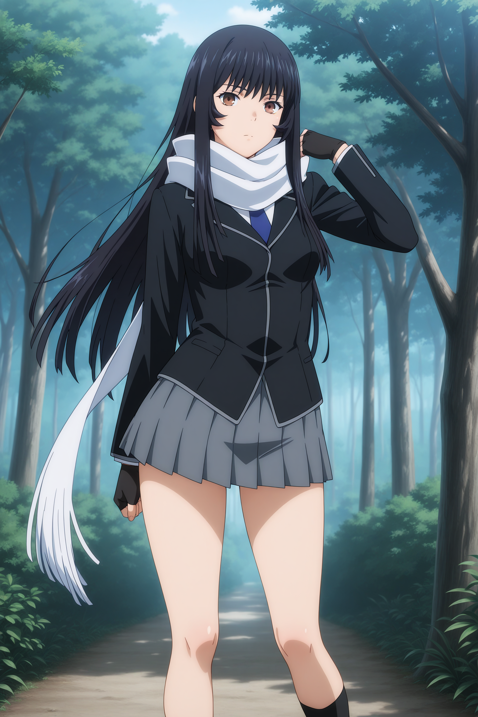 sasaki ganryu, long hair, black hair, blunt sidelocks, wispy bangs, brown eyes, long sleeves, black jacket, white shirt, collared shirt, blue necktie, white scarf, black gloves, fingerless gloves, grey skirt, pleated skirt, black socks, ankle socks, brown footwear, high heels