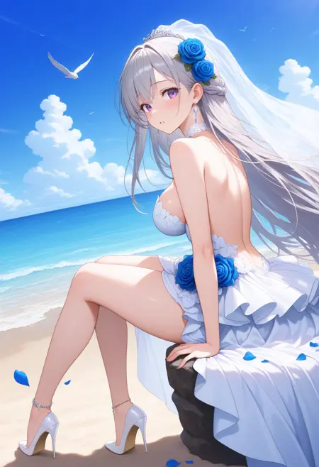 bridal veil, hair flower, hair ornament, earrings, jewelry, strapless dress, white dress, backless dress, layered dress, dress flower, blue flower, blue rose, petals, stiletto heels, white footwear, high heels, anklet, official alternate costume, bare shoulders, bare arms, bare back, bare legs, thighs, bride