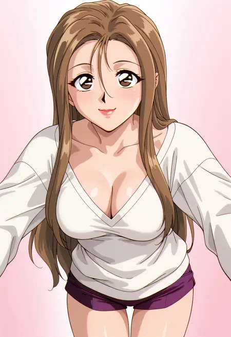 lipstick, white sweater, v-neck, cleavage, purple short shorts, bare legs