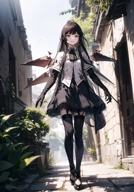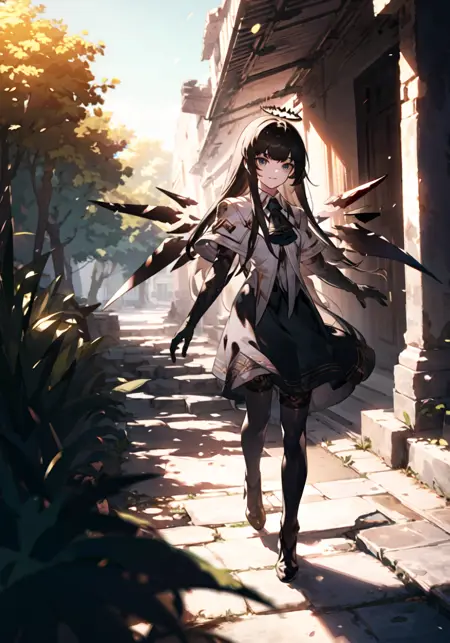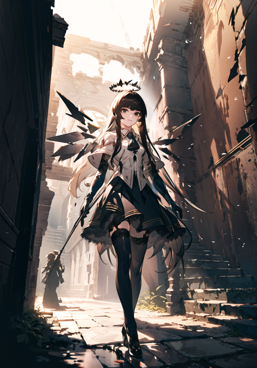 关键词包括:black_hair, very_long_hair, blunt_bangs, straight_hair, black_eyes, elbow_gloves, black_thighhighs, white_capelet, belt_pouch, detached_wings, black_wings, halo, high_heels, lace-trimmed_thighhighs等