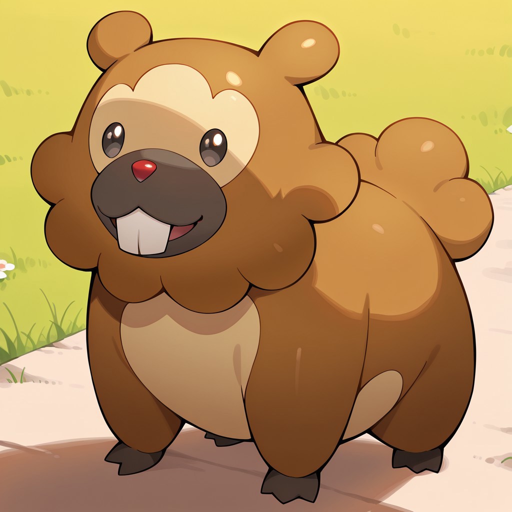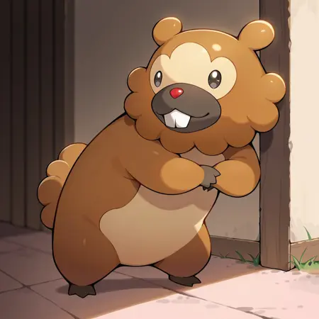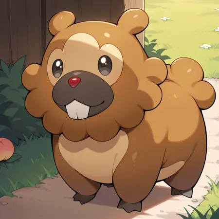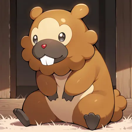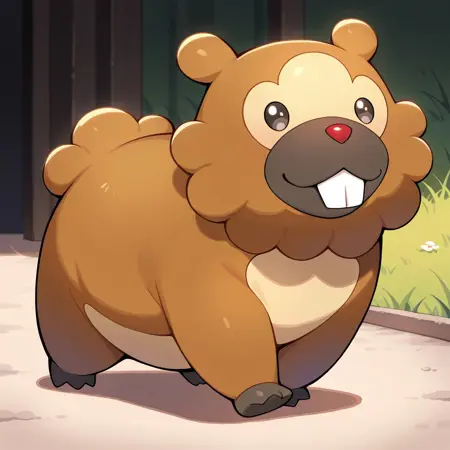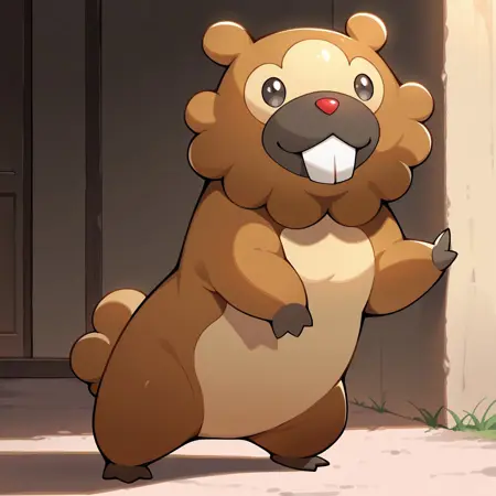 bidoof, brown fur, peach face, beady eyes, red nose, dark grey muzzle, buck tooth, peach underbelly, dark grey feet, fluffy tail