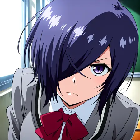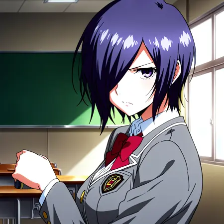 학교 유니폼: 1girl, kirishima touka, short hair, purple hair, purple eyes, school uniform, serious expression, anime screencap,