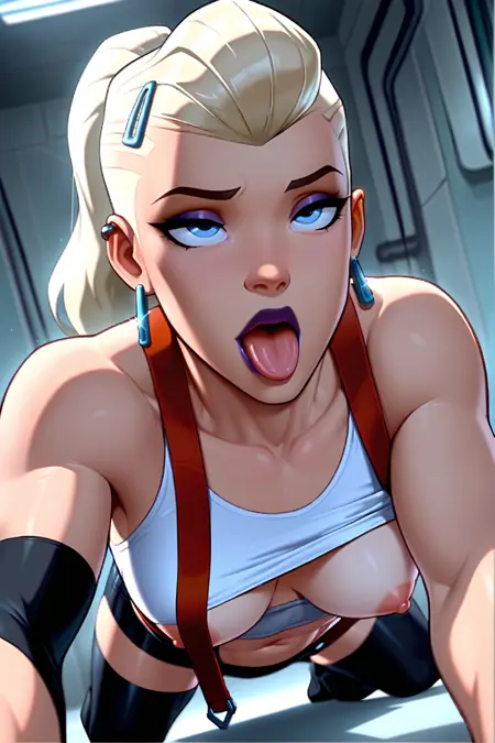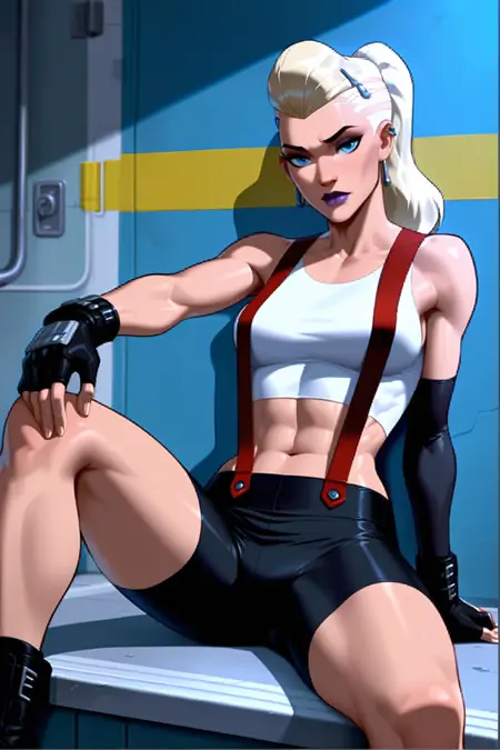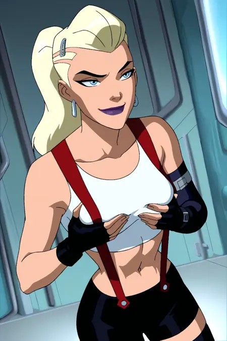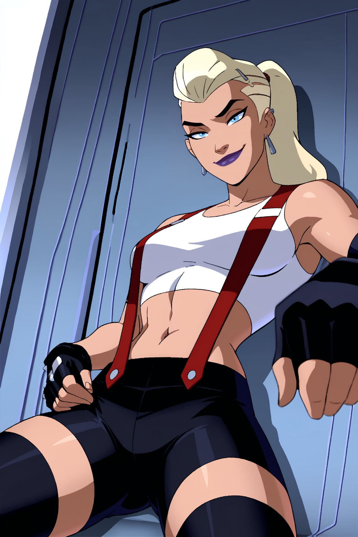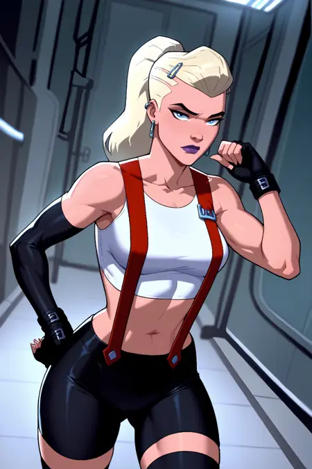 デフォルトの服装 - 黒い太ももハイズ、クロップトップ、サスペンダー、タンクトップ、指なしグローブ、ヘアクリップ、化粧、バイクショーツ、肘グローブ、ジュエリー、イヤリング、非対称グローブ、黒い手袋、へそ、腹筋、紫の唇、黒いショーツ