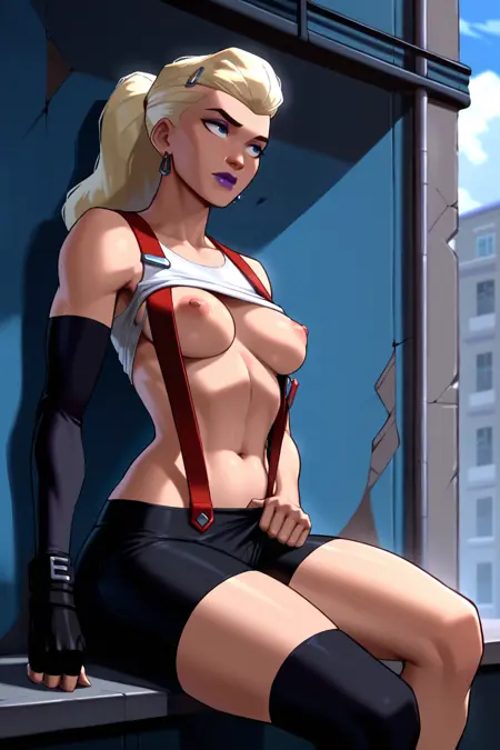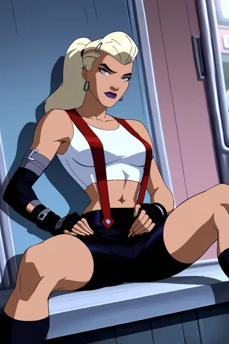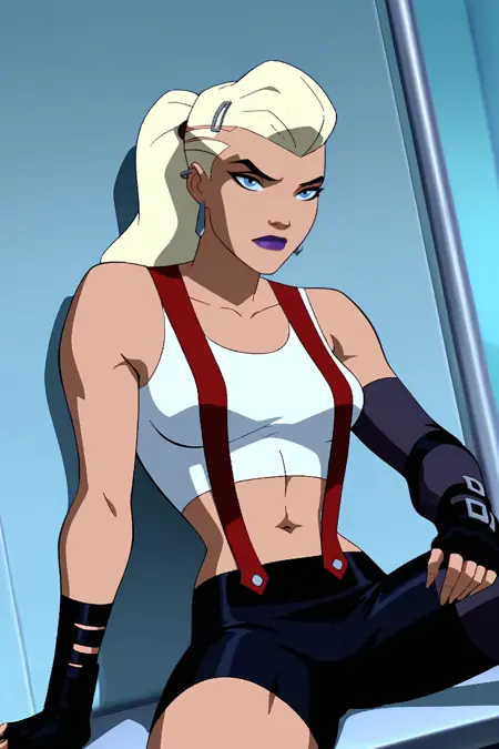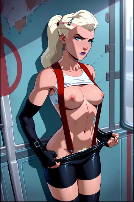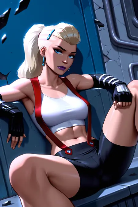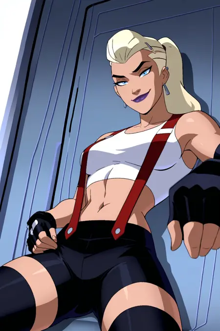 Default outfit - black thighhighs, crop top, suspenders, tank top, fingerless gloves, hairclip, makeup, bike shorts, elbow glove, jewelry, earrings, asymmetrical gloves, black gloves, navel, midriff, purple lips, black shorts.