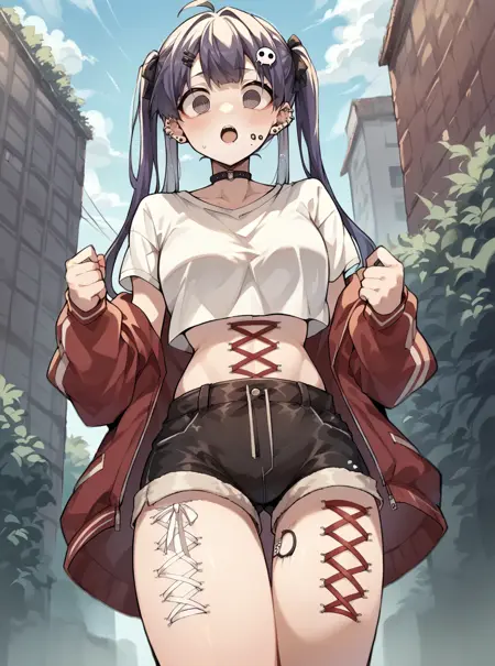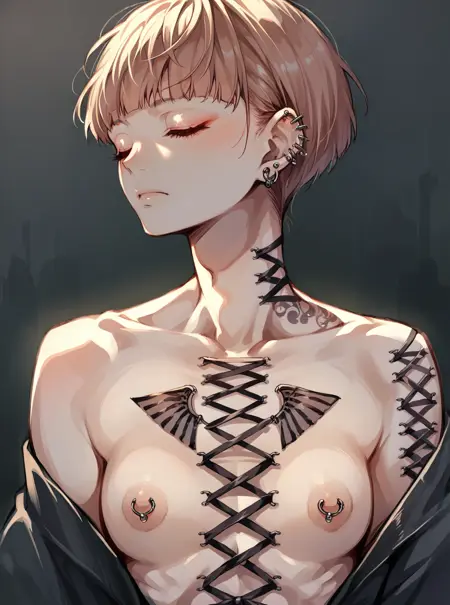 매우 민감한 편이에요... 하지만 뒷면에 피어싱을 넣는 데는 완벽해요. 이상하게 어느 정도 형성되지 않은 것들을 타투로 바꿔주는 효과가 있기 때문에, 임시 해결책으로 '타투' 태그를 추가하는 것을 추천합니다. 또한 룩에도 잘 어울리죠. 나중에 인페인팅을 시도해 봐야겠어요.