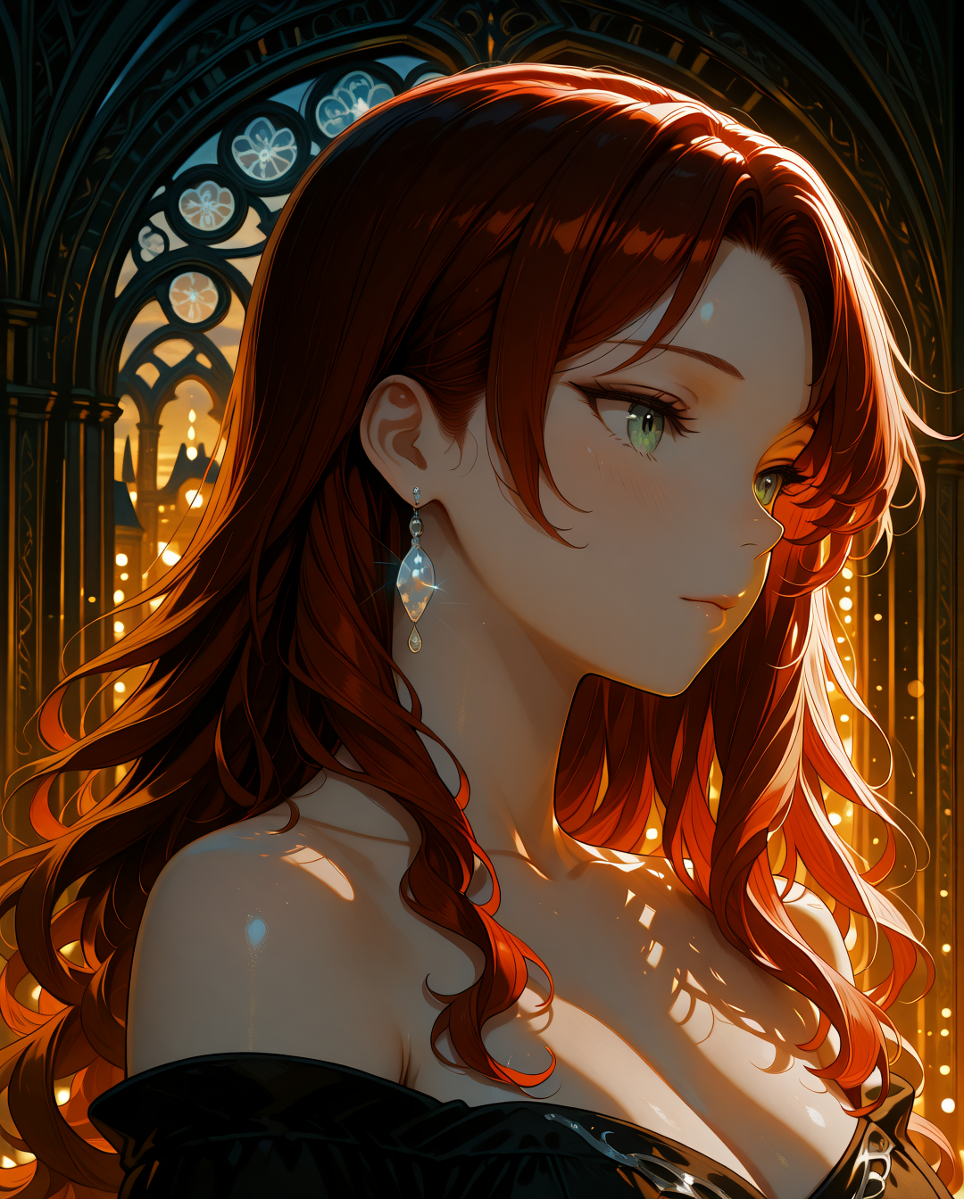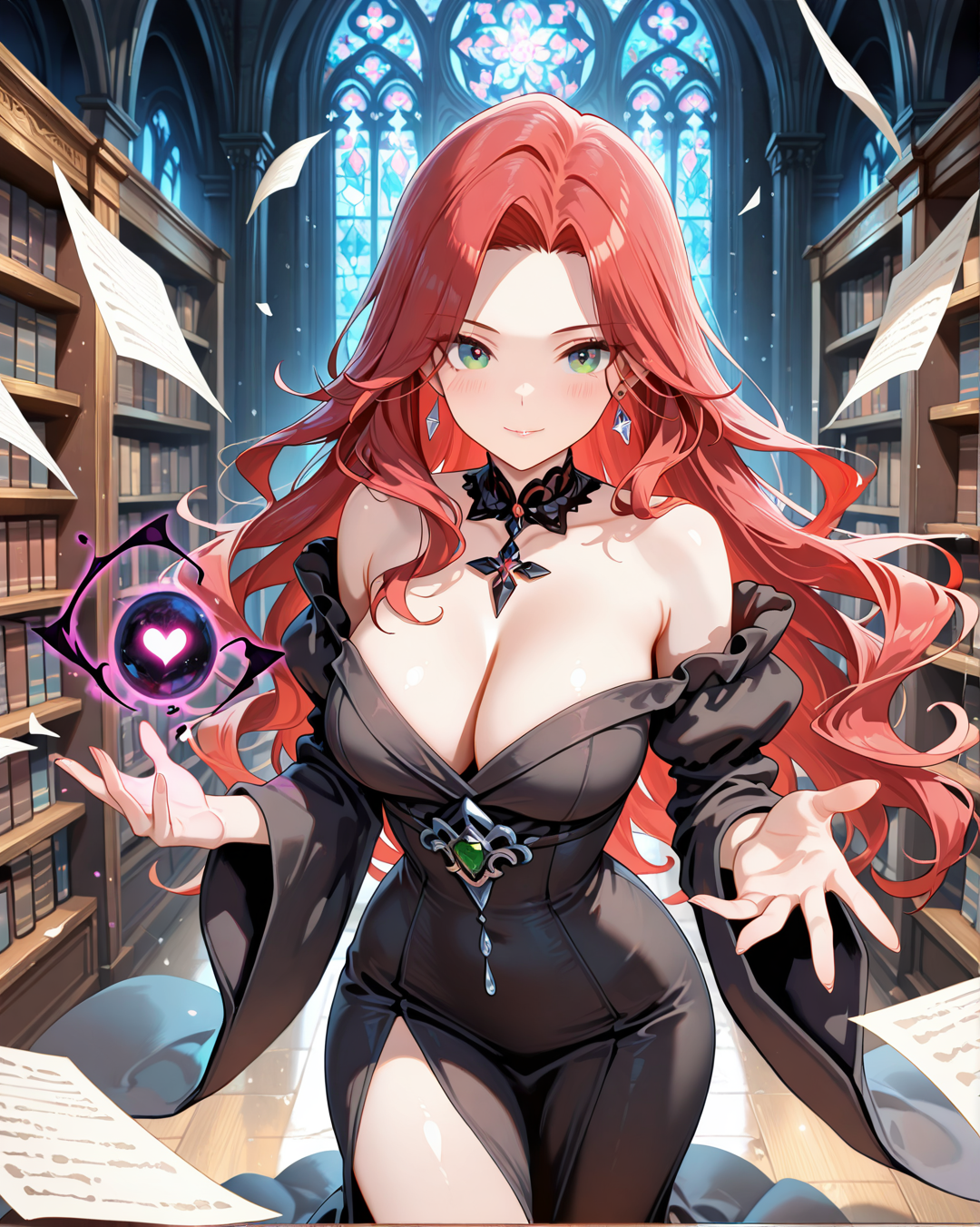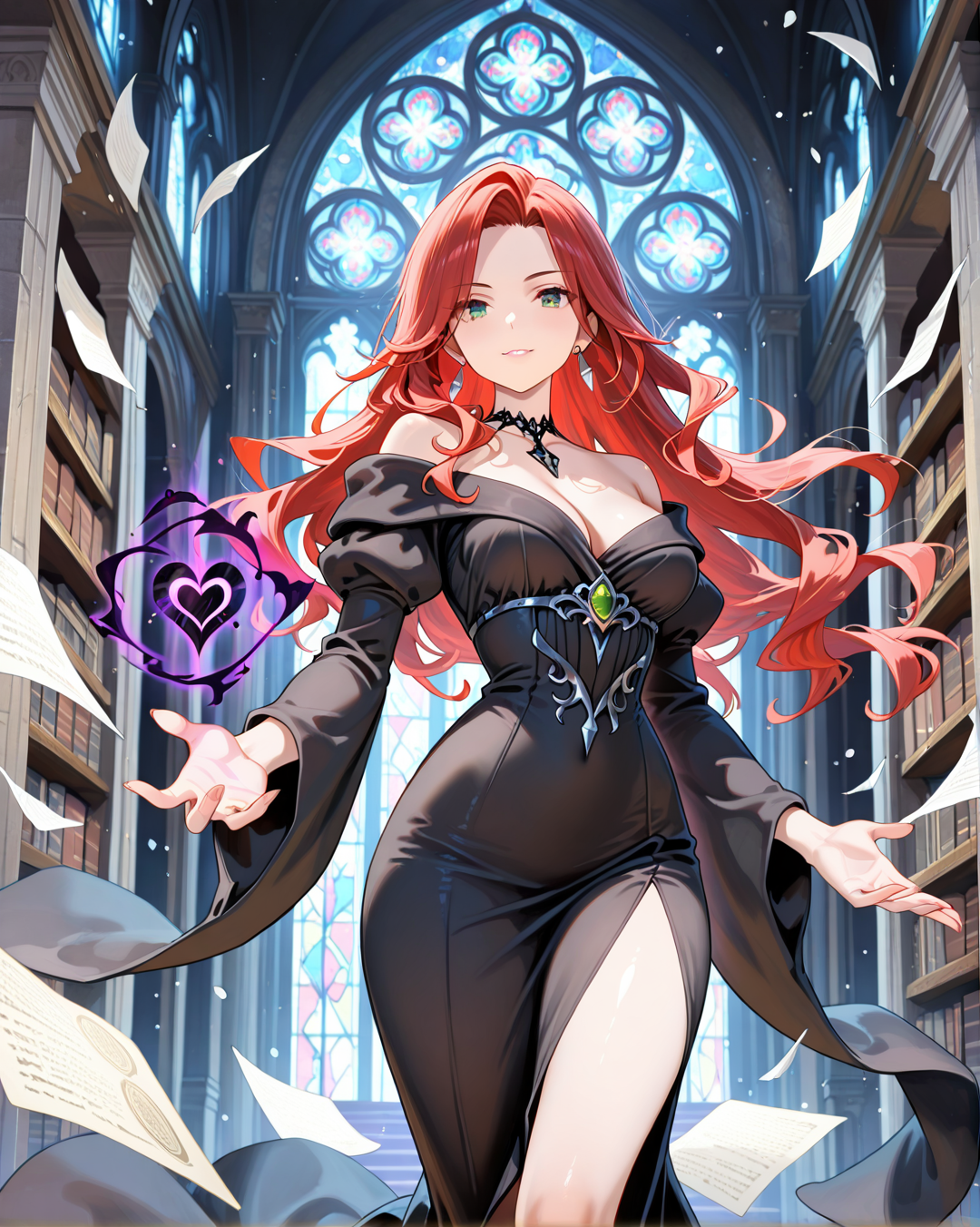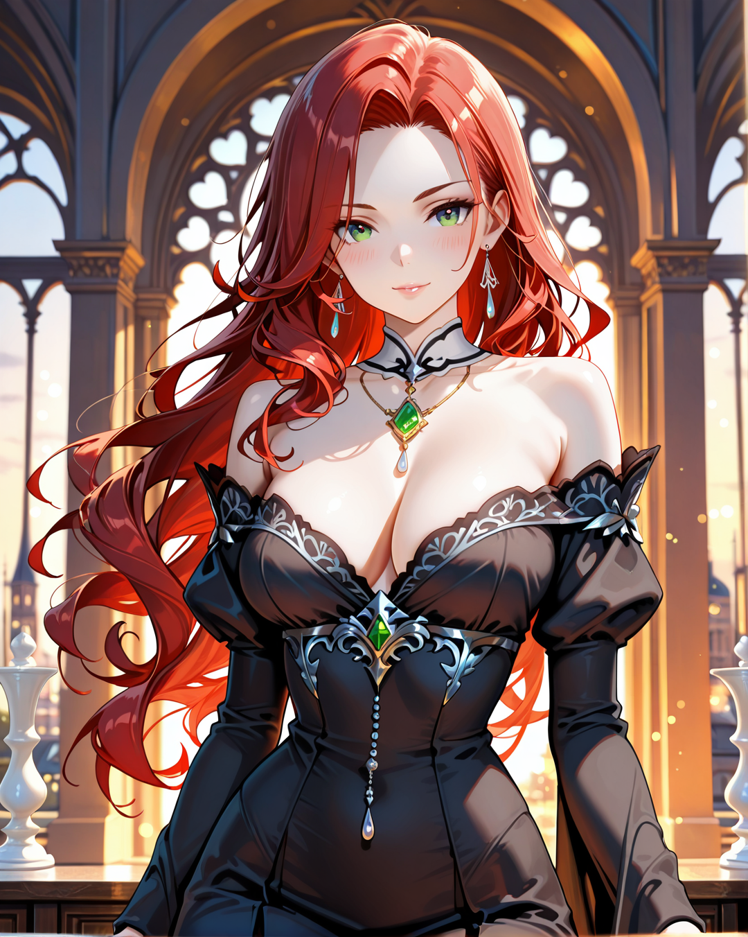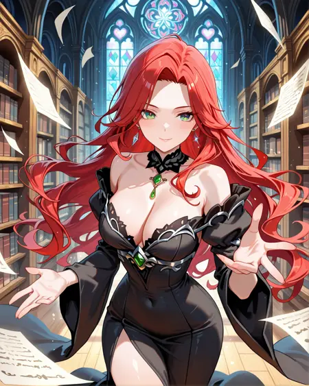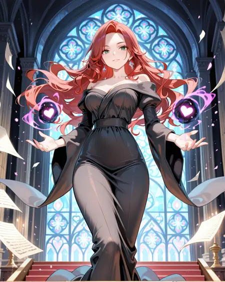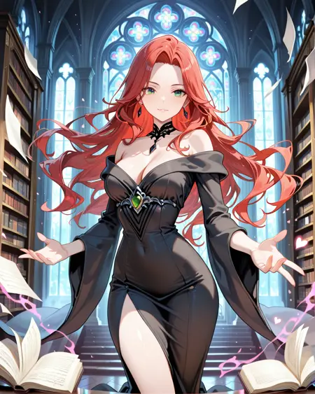 Miranda from Last Reader Standing, elegant and feminine, medium chest, intense green eyes, long deep crimson hair, wearing an off-shoulder black gown, form-fitting long black dress, subtle draping, smooth fabric folds,