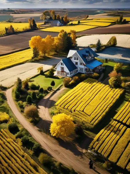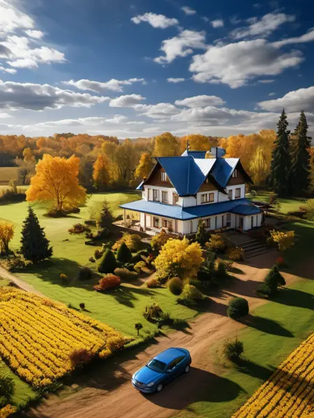 tip: You can use autumn, outdoors, sky, day, cloud, tree, blue_sky, no_humans, nature, scenery, mountain, road, house, landscape, these prompts or part of them to assist in the generation.