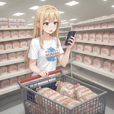 Prompt wonderbread to activate the LoRA. This LoRA generates a person on a bread aisle with shelves full of Wonder Bread, with a shopping cart full of bread. Optionally add holding cellphone to your prompt for the full effect.