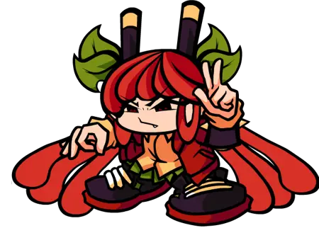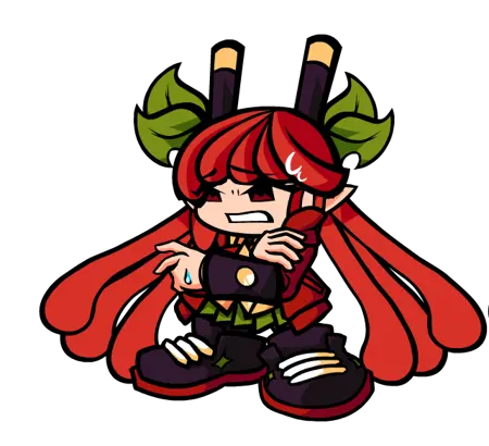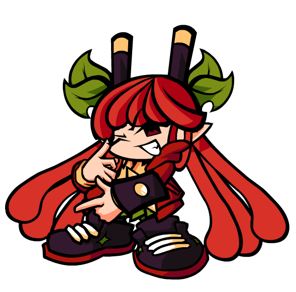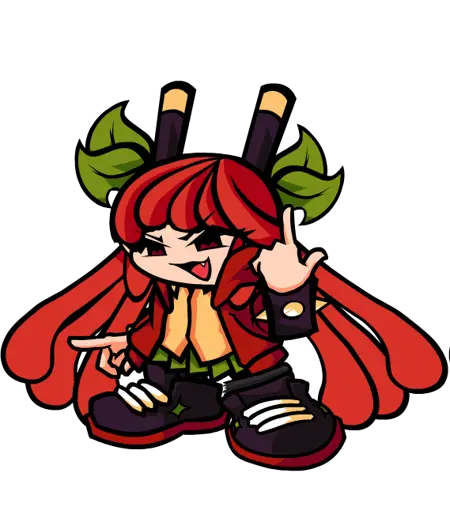 Smol Spicy, chibi, crimson_red_hair, leaf_ornament, tube_horns, red jacket, yellow_shirt, big_shoes, fang, solo, full_body, cartoonized