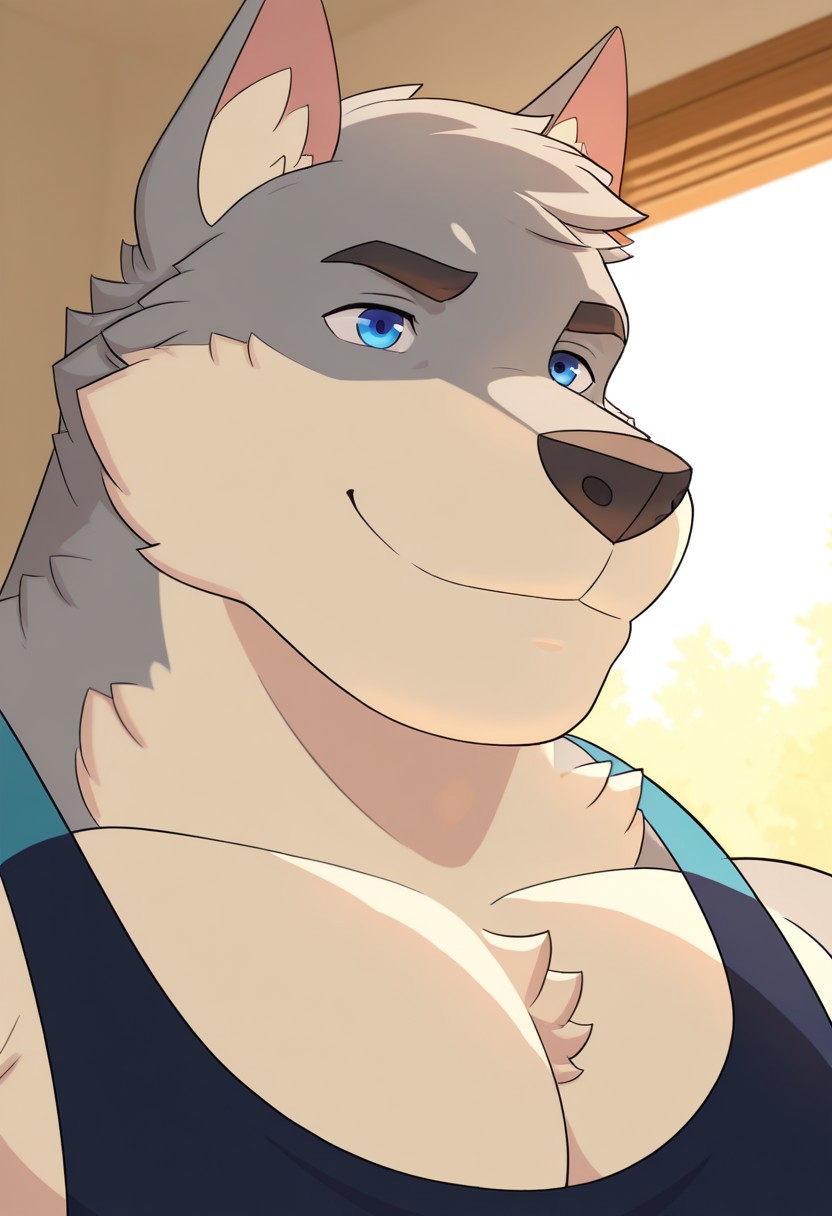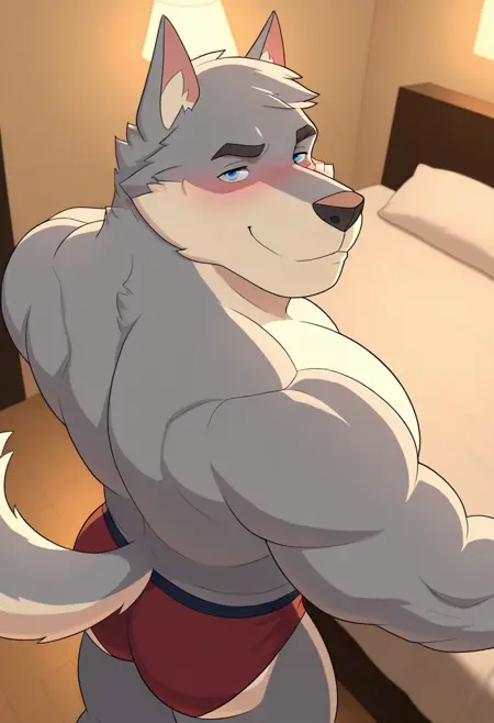 强化提示词:""wolf boy, furry, tail, blue eyes, muscular, masculine, bara, large pectorals""