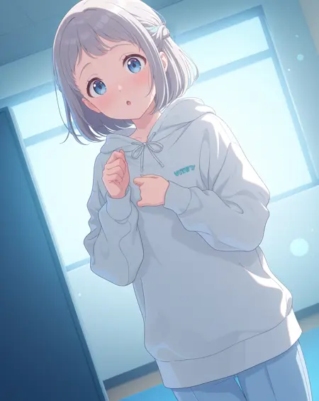 训练服:liljatraining,长袖,连帽,连帽衫,裤子,白色连帽衫,帽子放下,蓝色裤子