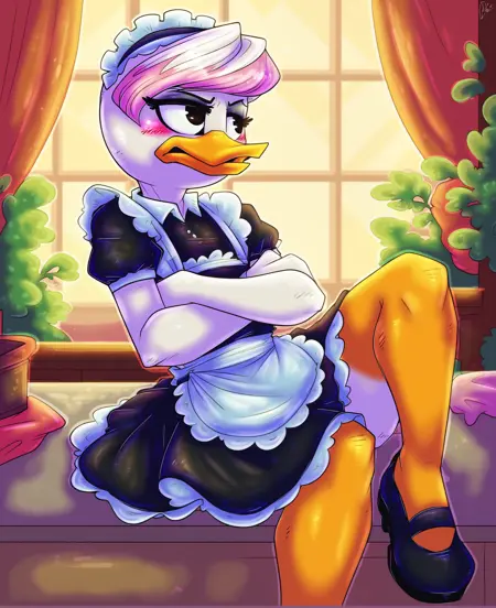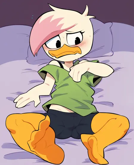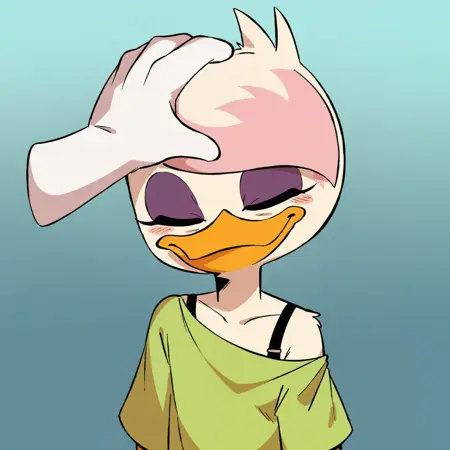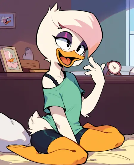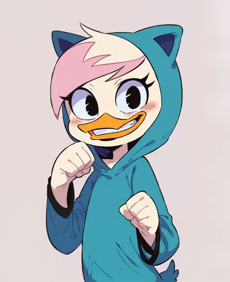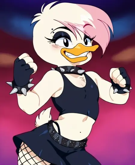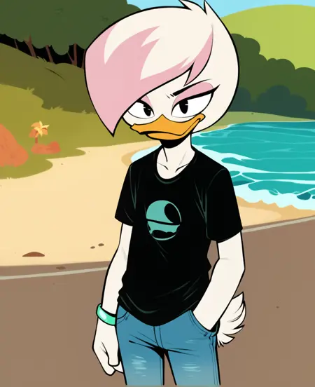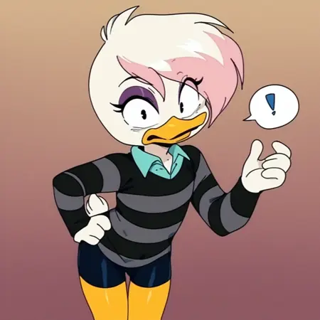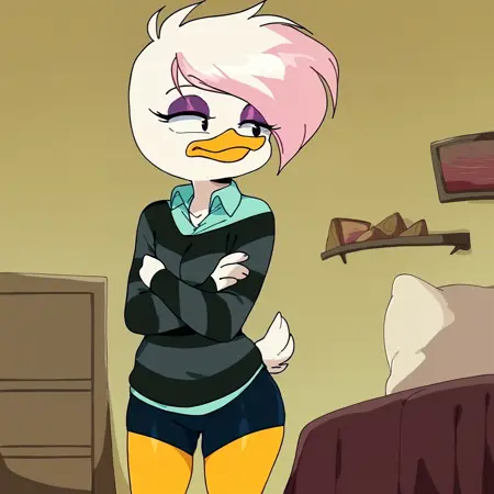 lena sabrewing, ducktales, duck, beak, scut tail, white skin, white hair, pink highlights, short hair, eyeliner, purple eyeshadow, pink eyeshadow, orange legs, webbed feet,