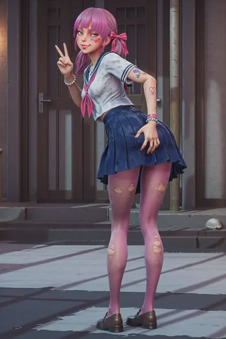 Kojira_Kaiju, 3d, 粉色头发, 低马尾辫, 发带, 齐刘海, 绿色眼睛, 口红, 妆容, 小胸, 面部彩绘, 纹身, 校服, 百褶裙, 粉色连裤袜, 破损连裤袜, 手腕环, 手镯, 链条, 珠子项链, 珠子手镯, 鞋子, 粉色指甲, 指甲,