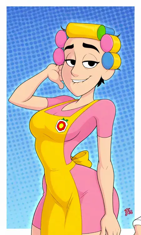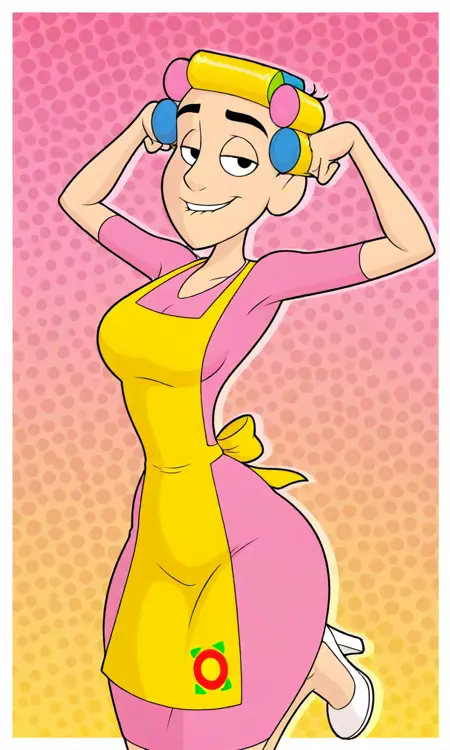 black eyes, pink-dress, yellow apron, hair rollers, white heels,