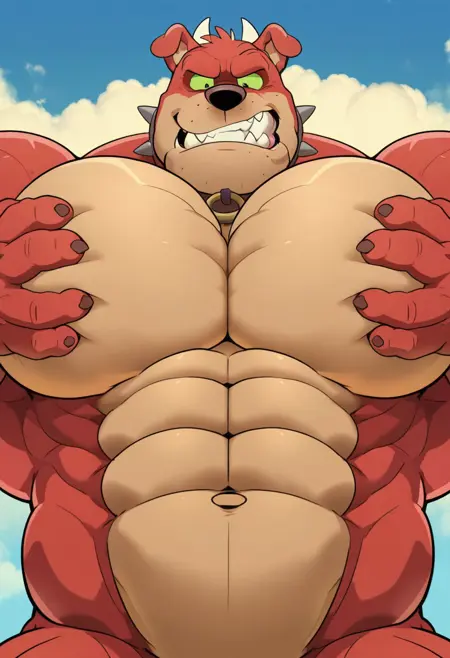Reinforcement Prompts: "dog boy, furry, small white horns, green sclera, black eyes, muscular, masculine, bara, large pectorals"