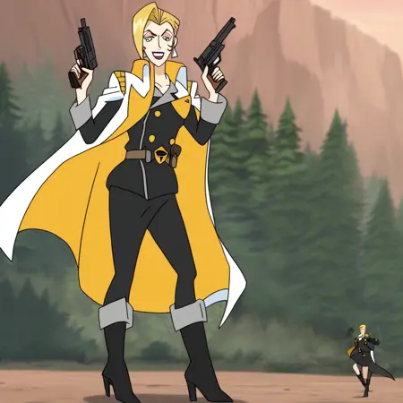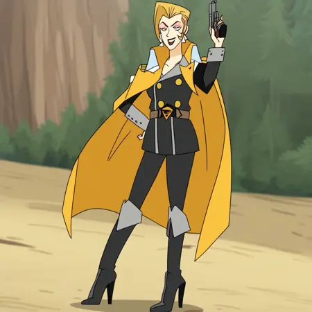 charlemagne, blonde, hair, short hair, lipstick, eyeshadow, earrings, uniform, military uniform, gloves, belt, high heel boots, cape