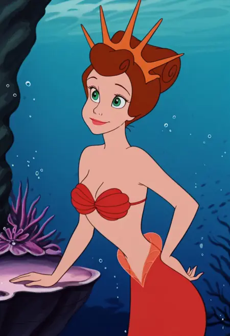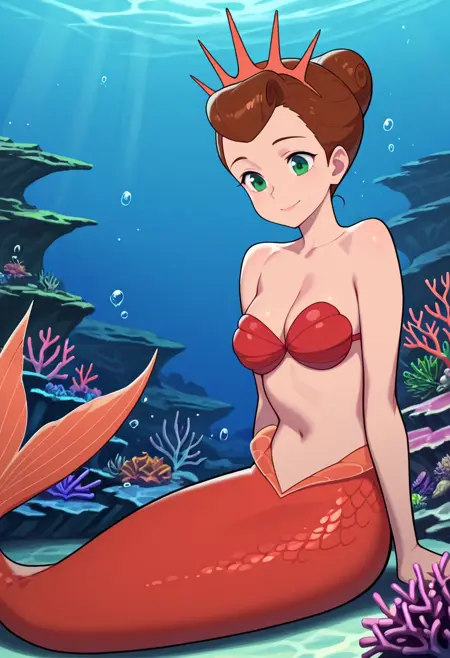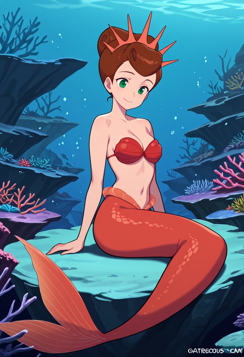 Appearance: brown hair, hair bun, green eyes, crown, medium breasts, monster girl, mermaid, orange tail, scales