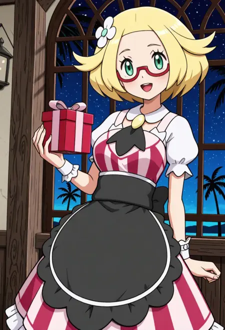 머리 리본, 분홍 리본, 머리 꽃, 흰 꽃, 칼라 드레스, 줄무늬 드레스, 빨간 드레스, 분홍 드레스, 다채로운 드레스, 퍼프 슬리브, 검은 애스코트, 손목 커프스, 허리 앞치마, 검은 앞치마, 검은 팬티스타킹, 신발, 빨간 신발, 신발 리본