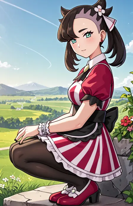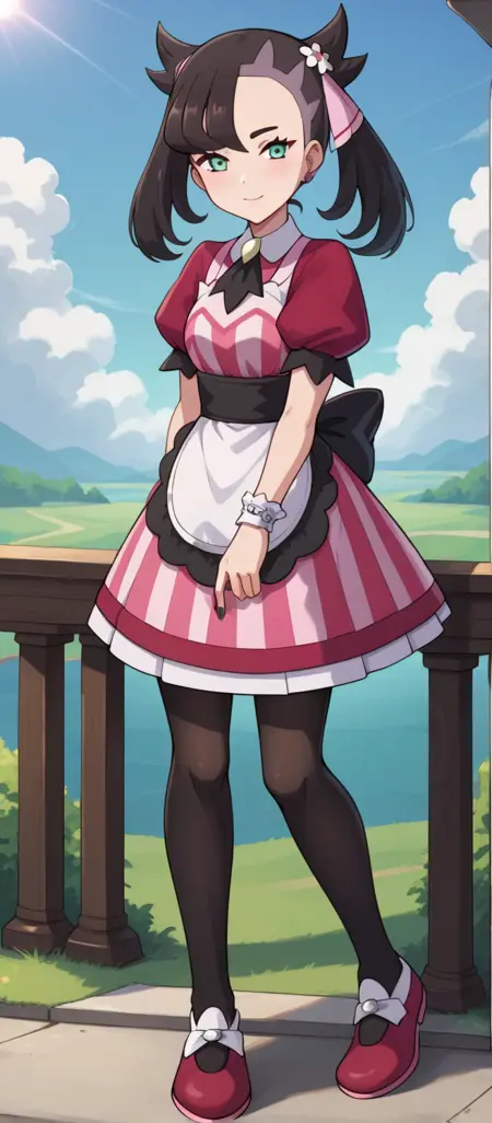 パルマニー、マニー(ポケモン)、緑の目、黒髪、非対称な前髪、ミディアムヘア、ツインテール、片耳にイヤリング、黒い爪