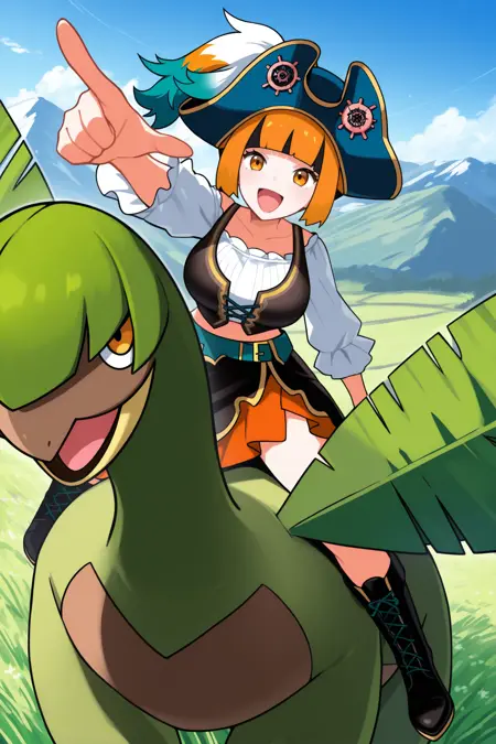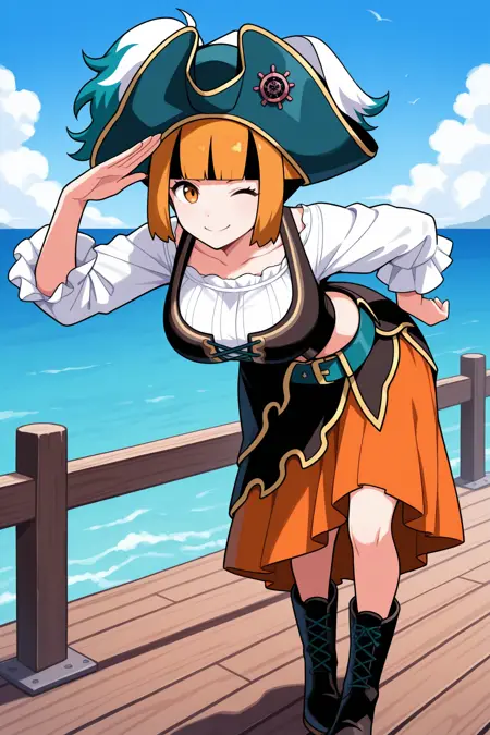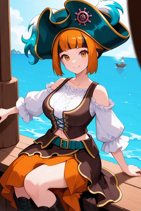 Add "smrntn, short hair, orange hair, multicolored hair, sidelocks, black hair, blunt bangs, amber eyes, dark blue hat, pirate hat, white shirt, frilled shirt, frilled sleeves, black vest, teal belt, orange skirt, black overskirt, black boots, lace-up boots" for her Pokemon Masters Summer 2024 look.