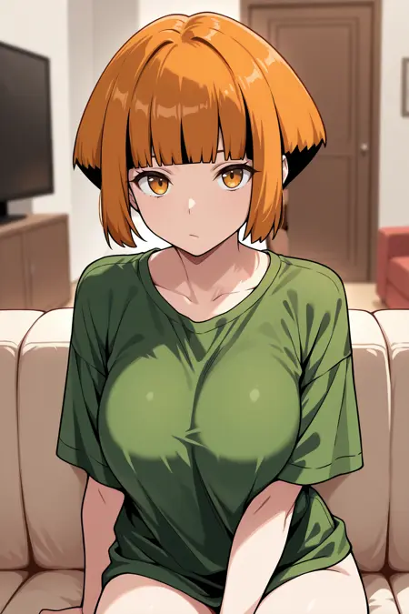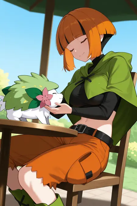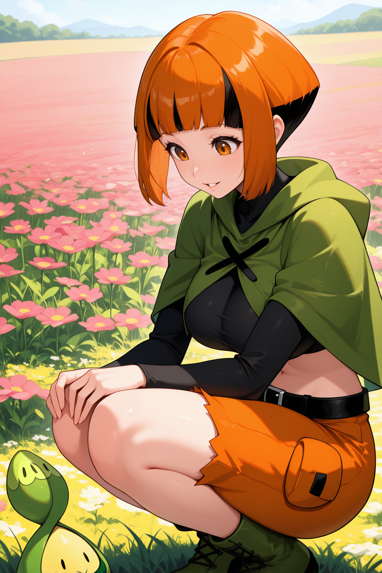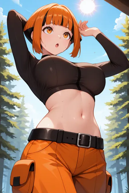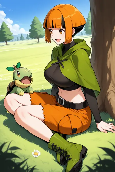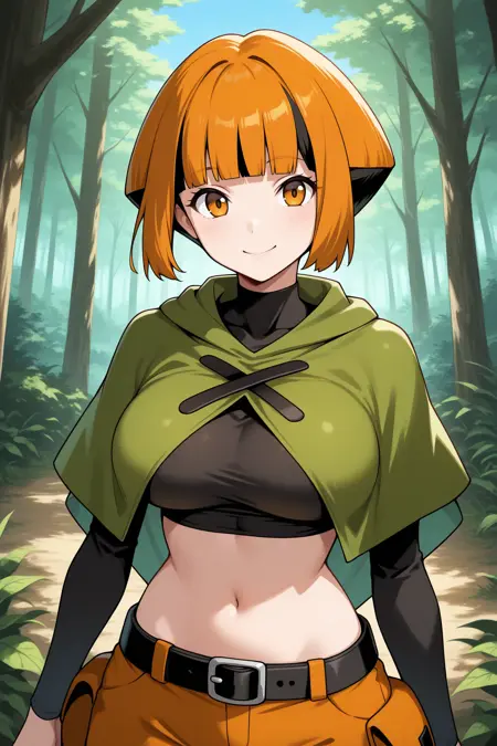 Add "defntn, short hair, orange hair, multicolored hair, sidelocks, black hair, blunt bangs, amber eyes, black shirt, long sleeves, cropped shirt, green poncho, midriff, black belt, orange shorts, green boots" for her typical look.