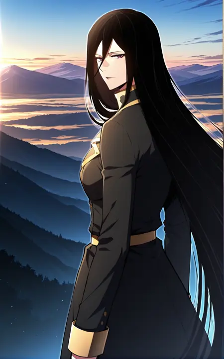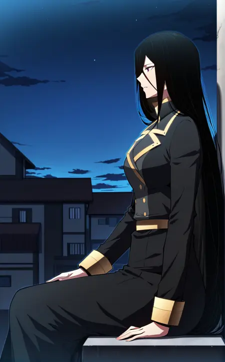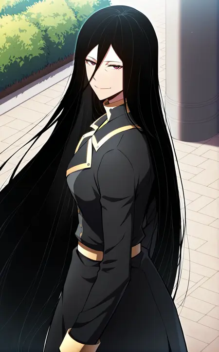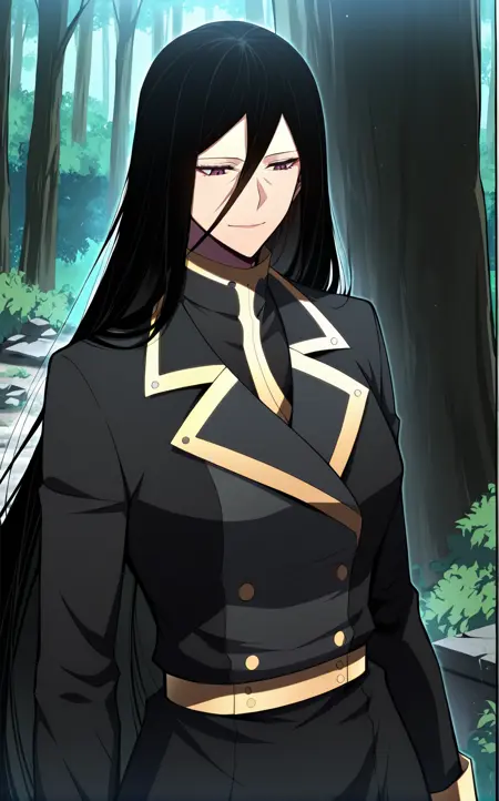 Rosa, 1 girl, solo, black hair, long hair, straight hair, hair between eye, hair over shoulders, side part, side-swept bangs, mature woman,