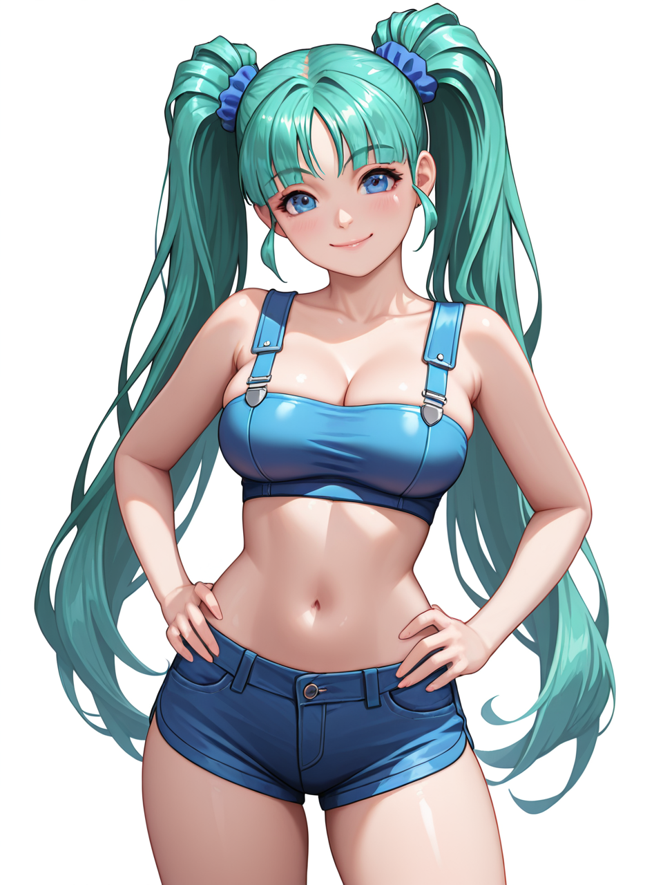 adnicos, breasts, twintails, long hair, blue scrunchie, blue shorts, bandeau with shoulder straps,