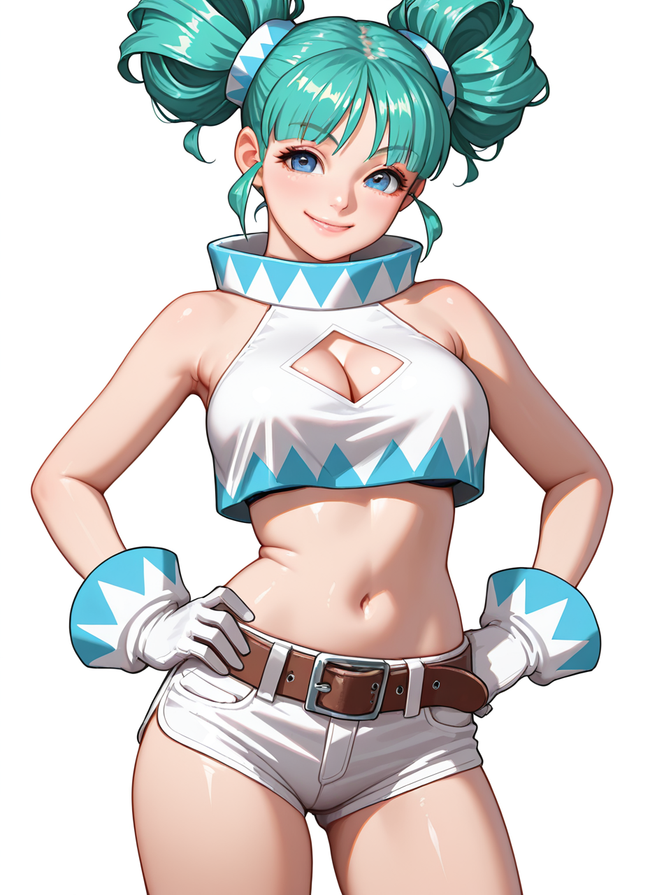 adnico1, midriff, cleavage cutout, belt, white shorts, short shorts, white gloves, breasts, double bun,