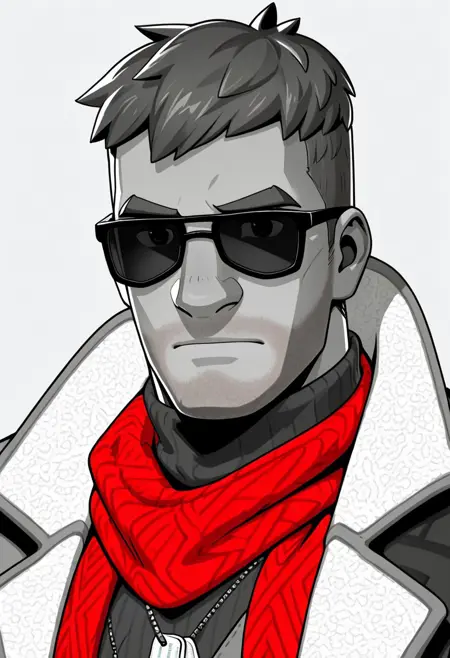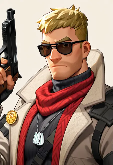 프롬프트: 금발 머리, 단발, 언더컷, 얼굴 수염, 까칠한 수염, 선글라스, 재킷, 빨간 스카프, 터틀넥 스웨터, 목걸이, 개체표, 벨트, 청바지, 부츠,