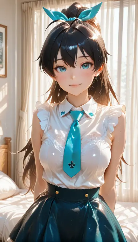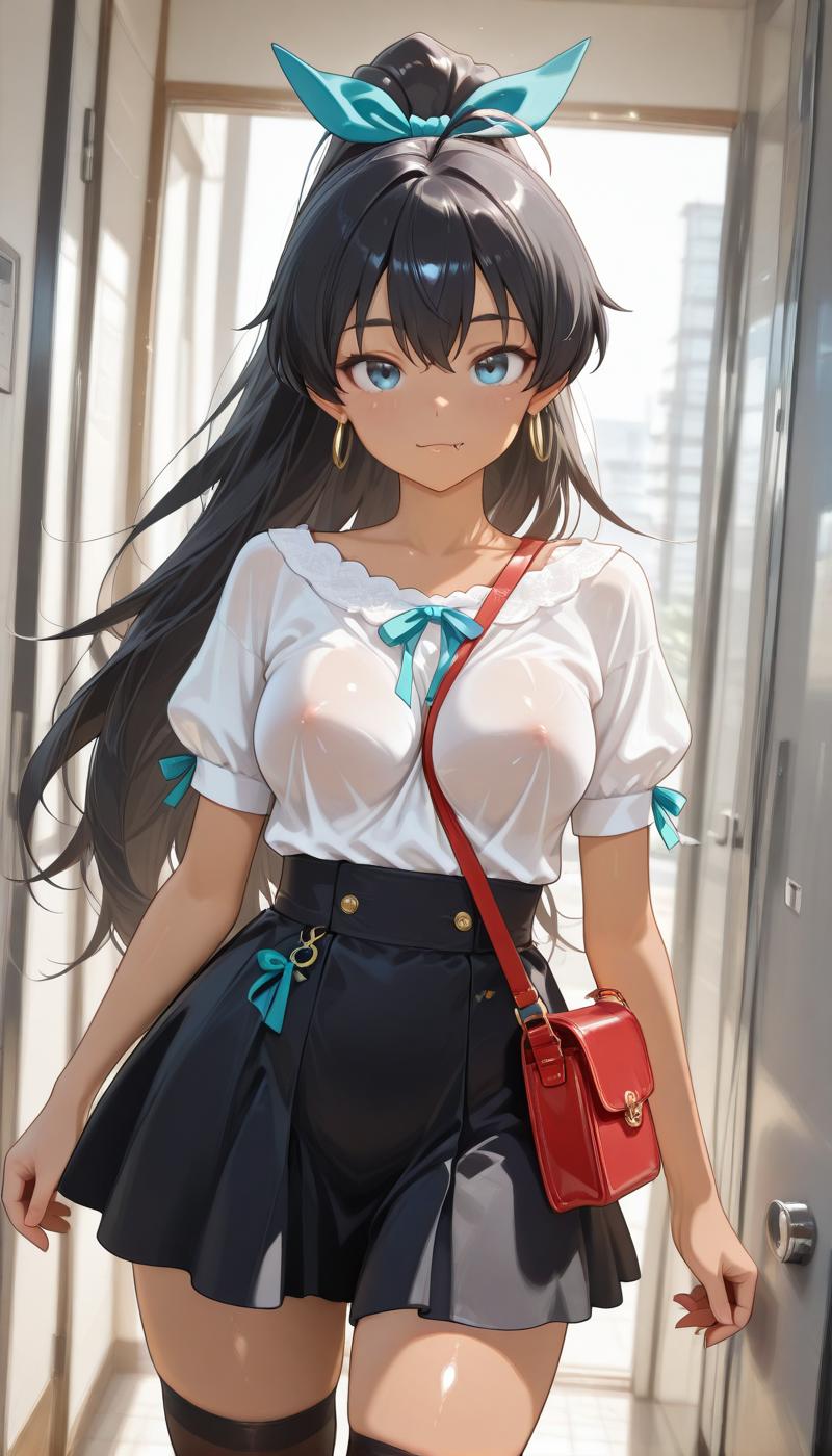 シャツ、スカート、ロングスリーブ、リボン、ジュエリー、鎖骨、白いシャツ、髪留め、髪のリボン、ピアス、プリーツスカート、黒いスカート、ミニスカート、バッグ、乳首隠し、透け感、絶対領域、ボタン、青いリボン、青いリボン、胸の間、ハイウエストスカート、ショルダーバッグ、リングイヤリング、ハンドバッグ、透けシャツ、胸の間にストラップ、アクアリボン、赤いバッグ、太ももハイ、ショートスリーブ、ふわふわスリーブ、緑のリボン、