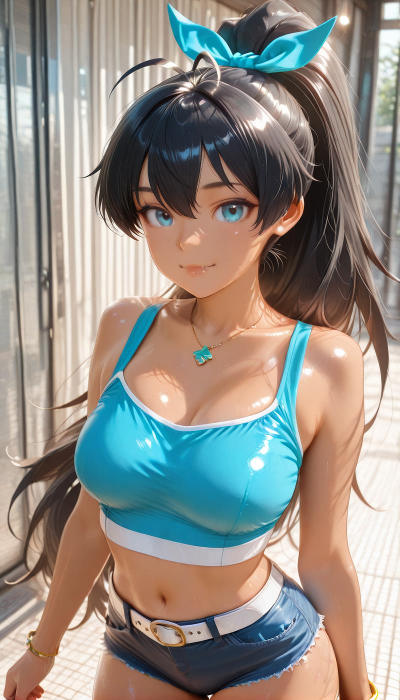 リボン、ジュエリー、肩出し、水着、髪留め、太もも、髪のリボン、ビキニ、ショートパンツ、ベルト、ネックレス、ブレスレット、クロップドトップ、短いショートパンツ、腕出し、足出し、青いリボン、青いリボン、デニム、ビキニトップのみ、青いビキニ、青いショートパンツ、デニムショートパンツ、スポーツブラ、ブレスレット、白いベルト、マイクロショートパンツ、青いスポーツブラ