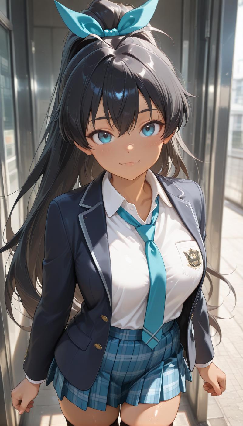シャツ、スカート、ロングスリーブ、太ももハイ、リボン、ジャケット、学ラン、白いシャツ、髪留め、髪のリボン、プリーツスカート、オープンクローズ、ネクタイ、シャツカラー、黒い太ももハイ、ミニスカート、オープンジャケット、黒いジャケット、青いスカート、絶対領域、チェック柄、チェック柄スカート、青いジャケット、ブレザー、青いリボン、青いネクタイ、ポケット、シャツをインする、胸ポケット、アクアネクタイ、ルーズネクタイ、アクアリボン、