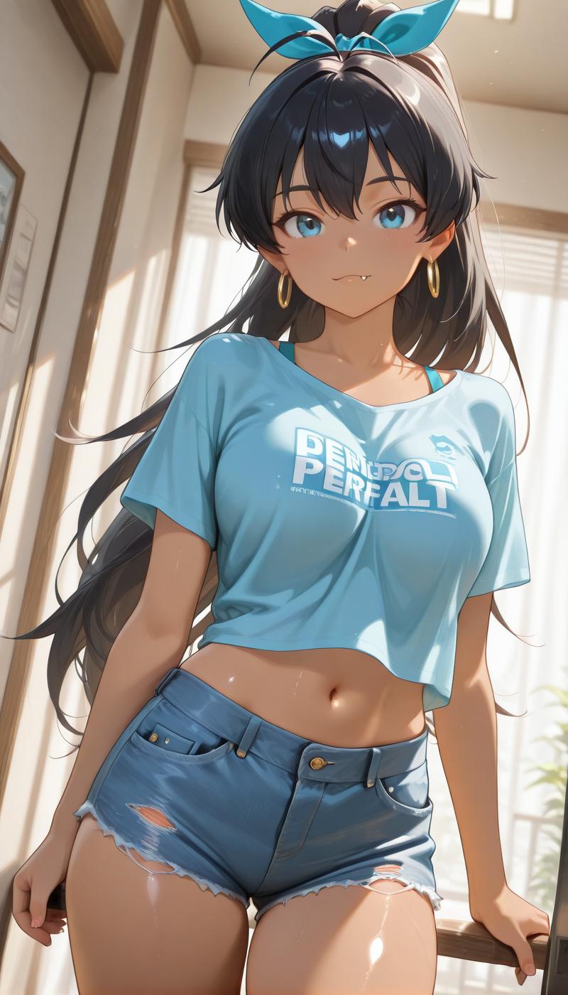 シャツ、リボン、へそ、ジュエリー、鎖骨、髪留め、ショートスリーブ、太もも、髪のリボン、ピアス、ショートパンツ、おへそ出し、お腹、クロップドトップ、破れた服、短いショートパンツ、青いシャツ、青いリボン、デニム、青いショートパンツ、デニムショートパンツ、リングイヤリング、おへそ出し、クロップドトップの重なり、カットオフ、ブラストラップ、破れたショートパンツ、Tシャツ、
